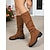 バックルとキャンバス地を使用したレディースブラウンのフェイクレザー乗馬ブーツ。仕事、旅行、アウトドアに最適なカジュアルなツートンカラーのニーハイブーツ。