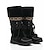 バックルストラップ付きのレディース用ブラックのゆったりしたフェイクスエードニーハイブーツ。秋冬の装いにぴったりのカジュアルヴィンテージスタイル。