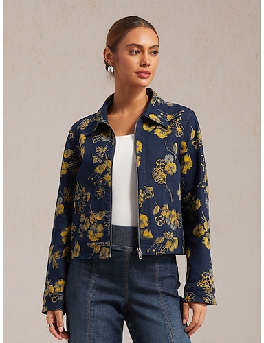 レディースジャケット デニム生地 カラーブロックプリント イエロー 花柄 ターンダウンカラー ジッパーデザイン カジュアル ホーム 旅行 秋 冬