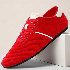 洗練された白いストライプが入ったメンズの赤いスニーカー。高級牛革素材を使用。流行に敏感なカジュアルウェア、ストリートスタイル、アクティブな日に最適です。