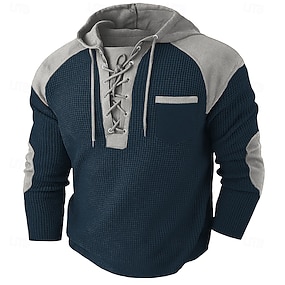 男性用 Tシャツ ワッフルニットTシャツ ティートップ 長袖シャツ 長袖 フード付き 春 & 秋 カラーブロック ファッション デザイナー ベーシック ドローストリング ニット バケーション ストリート お出かけ ダークブルー アーミーグリーン グレー メンズトップTシャツ