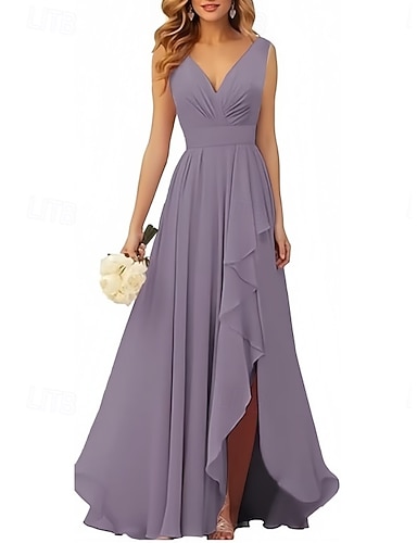 Aライン ブライドメイドドレス Vネック ノースリーブ エレガント フロア丈 シフォン とともに ラッフル / フロントスリット / フリル 2022