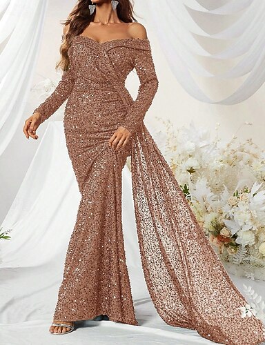 シースイブニングガウンエンパイアドレスフォーマルイブニングスウィープ/ブラッシュトレインロングスリーブボートネック秋のウェディングゲストシフォンプリーツ付きドレスインプレッション
