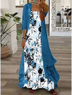 女性用 ドレスセット マキシドレス A ラインドレス サマードレス 旅行度假风 ボヘミアン フラワー グラフィック 多層式 プリント マキシドレス 七分袖 クルーネック アウトドア 日常 ブルー 夏 春 ルーズフィット