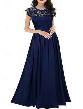 女性用 ロングドレス マキシドレス レースドレス 二次会ドレス / カクテルドレス ウェディングゲストドレス シフォン エレガント ファッション 近代の アウトドア カクテルパーティー レギュラー 平織り 半袖 クルーネック ブラック ワイン ネイビーブルー グリーン 夏 春 秋