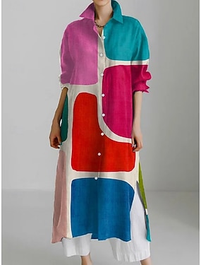 ウィメンズミディドレス シャツドレス カジュアルドレス アウトドア オフィス デイリーファッション モダン シャツカラー ボタン ポケット ロングスリーブ フォール ウィンター ルーズフィット カラーブロック グラフィティ