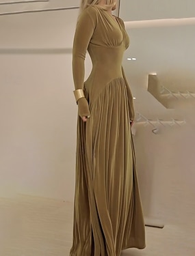女性用 ロングドレス マキシドレス ベルベットドレス プロムドレス パーティードレス 二次会ドレス / カクテルドレス エレガント 近代の パーティー レギュラー 平織り 長袖 Vネック ブラウン カーキ色 秋 冬