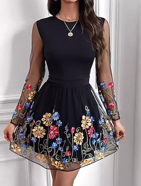 女性用 ミニドレス 黒いドレス 二次会ドレス / カクテルドレス フォーマルドレス A ラインドレス エレガント 結婚式のゲスト カクテルパーティー スリム フラワー 長袖 クルーネック ブラック 夏 春 秋