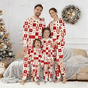 ファミリールック クリスマス クリスマスファミリーパジャマ パジャマ ファミリーセット グラフィック チェック しか 家 プリント ルビーレッド 長袖 日常 マッチング衣装