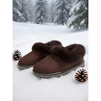 フェイクファーのトリムとラインストーンソールが付いたレディースのライトブラウンのスノーブーツ。家庭や冬のアウトドアに最適な、フェイクスエードの快適な冬用ブーツです。