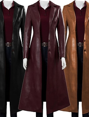 女性用 レザージャケット コート 保温 快適 ポケット ボタン カジュアル 平織り バケーション ストリート デイリーウェア お出かけ ロング 折襟 レギュラー 長袖 アウターウェア ブラック ワイン ブルー 秋 冬