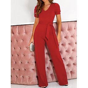 レディース ジャンプスーツ レースアップ ビーズ 無地 Vネック エレガント オフィス レギュラーフィット 半袖 ブラック アーミーグリーン レッド S M L 秋