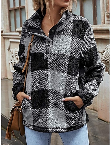 女性用 フリースの上着 テディコート 快適 高通気性 ポケット ボタン プリント カジュアル チェック バケーション ストリート カジュアル デイリーウェア ジッパ- レギュラー フード付き レギュラー 長袖 アウターウェア ブラウン 春 秋