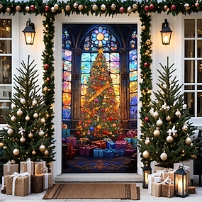 クリスマスドアデコレーション、ドアカバー、クリスマスツリー、ステンドグラス、ドアタペストリー、ドアカーテン、装飾背景、玄関ドア用ドアバナー、農家の休日パーティー装飾用品、屋内/屋外用
