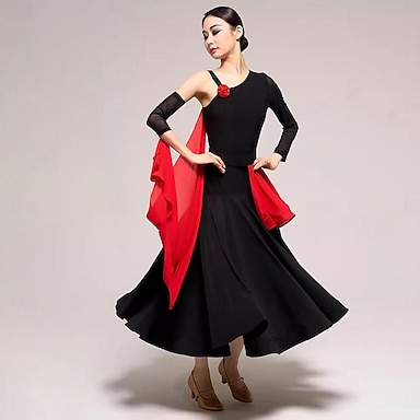 ボールルームダンス ドレス ピュアカラー スプライシング 女性用 性能 パーティー 長袖 クリスタルコットン メッシュ