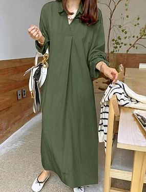 女性用 マキシドレス リネン風ドレス シャツドレス カジュアルドレス プレーンドレス カジュアル スポーツ ストリート レギュラー 平織り 長袖 シャツカラー グリーン アプリコット 春 秋