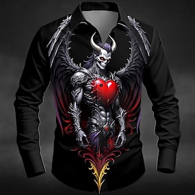 Halloween 男性用 ハート 蓄光 悪魔 シャツ ボタンアップシャツ 長袖 ダークパンクゴシック アウトドア 祝日 夏 春 折襟 3Dプリント 襟付きシャツ ルビーレッド パープル