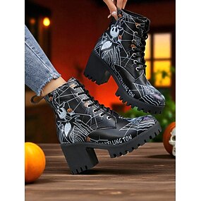蜘蛛の巣模様のハロウィンスカルプリントチャンキーヒールコンバットブーツ - コスプレ、トリックオアトリート、不気味な秋のファッションにぴったりのゴシックレースアップアンクルブーツ