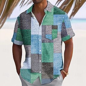 男性用 幾何学模様 カラーブロック パッチワーク シャツ サマーシャツ ボタンアップシャツ 半袖 ファッションカジュアル バケーション 祝日 ストリートウェア 夏 折襟 3Dプリント フロントポケット1つ リネンライクシャツ ブルー グリーン グレー