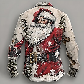 クリスマス メンズ サンタクロース プリント シャツ サンタクロース カジュアル ボタンアップ 長袖 パーティー イブニング デイリー 秋 冬 春&夏用カラーボタンアップ 3Dプリント 薄手レッドポリエステル