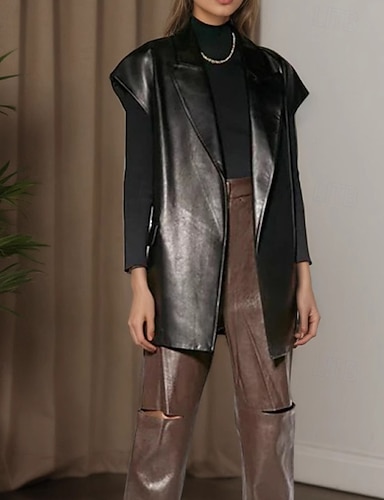 女性用 レザージャケット ベスト 快適 レースアップ ポケット ファッション 平織り アウトドア 祝日 デイリーウェア お出かけ オープンフロント ロング 折襟 レギュラー ノースリーブ アウターウェア ブラック キャメル 冬