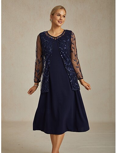 女性用 ドレッシーなトップス レーストップス フラワー エレガント スタイリッシュ ベーシック 長袖 クルーネック ロングトップス 結婚式のゲスト パーティーイブニングウェア セミフォーマル スパンコール ネイビーブルー 春 秋 冬