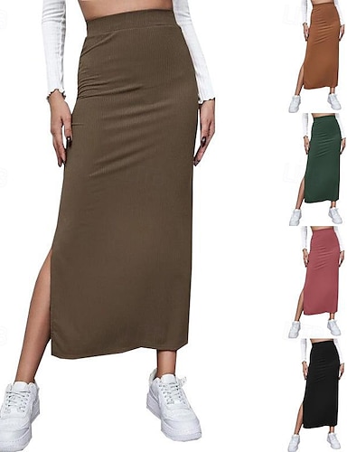 女性用 スカート カジュアル マキシ ミッドライズ スカート 平織り スプリットエンド マイクロエラスティック バケーション ストリート ブラック ルビーレッド ライトブラウン ブラウン 夏 ポリエステル