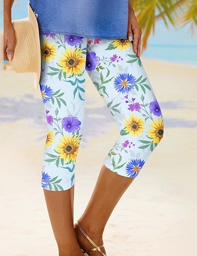 女性用 カプリパンツ レギンス 心地よいレギンス ストリートファッション カジュアル ふくらはぎ丈 ハイウエスト フラワー 弾性ウエスト 通気性 伸縮性あり バケーション ストリート デイリーウェア ディープパープル ネービー ブラック ブルー 秋 レギュラー