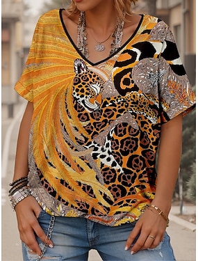 女性用 Tシャツ 動物 カラーブロック ヴィンテージ カジュアル 半袖 Vネック レギュラートップス 日常 プリント オレンジ 夏 春