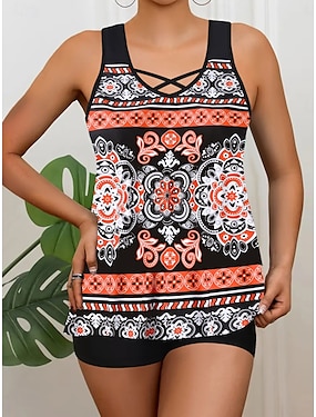 女性用 スイムウェア タンキニ 2ピース 男の子の足 水着 バックレス ハイウエスト 旅行度假风 ビーチウェア フラワー Vネック ノースリーブ 水着