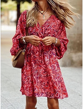 ウィメンズミディドレス コルセットドレス シフトドレス サマードレス パフスリーブドレス バケーション バケーション デイリー レギュラーフィット グラフィック 3/4レングススリーブ Vネック レッド ブルー パープル ブラウン サマー