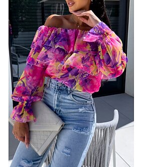 女性用 シャツ ブラウス フラワー リーフ柄 スタイリッシュ カジュアル 長袖 オフショルダー レギュラートップス 日常 ラッフル プリント イエロー ピンク パープル グリーン 夏 春