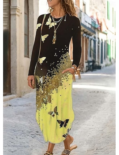 女性用 マキシドレス シースドレス A ラインドレス カジュアル ボヘミアン 結婚式のゲスト ビーチ レギュラー フラワー グラフィック 鳥 長袖 クルーネック イエロー 春 秋 冬