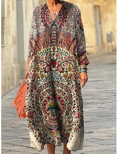 ウィメンズミディドレス Vネック ロングスリーブ カフタン 軽量 ルーズフィット Aラインドレス カジュアル ボヘミアン 外出用 ルーズフィット グラフィック 幾何学的 ロングスリーブ Vネック ライトブラウン 秋