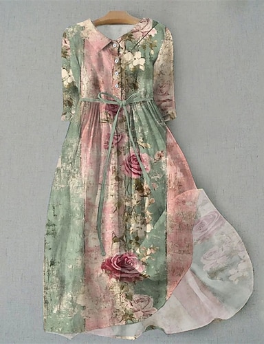 女性用 ロングドレス マキシドレス カジュアルドレス プリントドレス ファッション 近代の 日常 ビーチ 週末 レギュラー ストライプ フラワー 七分袖 Vネック ホワイト パープル グリーン 春 秋