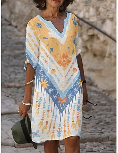 女性用 ミディドレス カジュアルドレス プリントドレス ヴィンテージ 日常 ビーチ 週末 レギュラー 幾何学模様 七分袖 クルーネック ブルー パープル フクシャ オレンジ 夏 春 秋