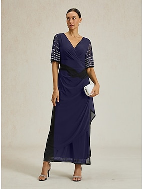 女性用 マキシドレス シースドレス エレガント 純色 半袖 Vネック ネイビーブルー 夏 春 秋
