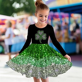 聖パトリック 女子 3D 四葉クローバー ドレス 長袖 3Dプリント 春 秋 スポーツ 日常 祝日 かわいいスタイル カジュアル 美しい 子供 3〜12年 カジュアルドレス A ラインドレス 膝上 ポリエステル レギュラー