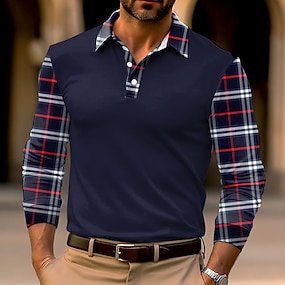 男性用 チェック ポロシャツ ゴルフシャツ 長袖 ポロシャツ 襟付きシャツ ビジネスカジュアル 作業服 フォーマルウェア フェスティバルウェア 3Dプリント ボタン 秋冬 ブラック ホワイト ダークネイビー