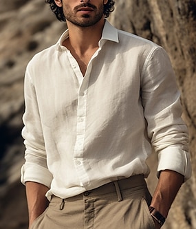 男性用 コットンリネンシャツ ホワイトコットンシャツ サマーシャツ カジュアルシャツ 平織り カジュアル 日常 ホワイト 長袖 Vネック 春夏 衣類 ドローストリング