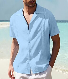男性用 シャツ リネンシャツ コットンリネンシャツ グアヤベラシャツ サマーシャツ ビーチシャツ 平織り バケーション カジュアル ブラック ホワイト ネイビーブルー ブルー 半袖 キャンプカラー 夏 衣類