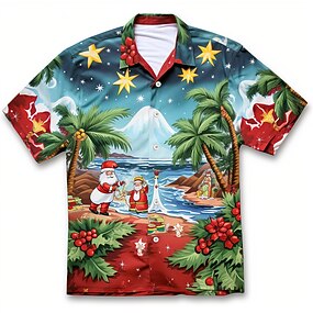 サンタクロース ヤシの木 カジュアル 男性用 シャツ デイリーウェア お出かけ 秋冬 折襟 長袖 バーガンディー, オレンジ S, M, L 4方向ストレッチ生地 シャツ クリスマス