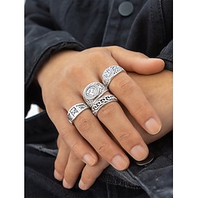 幾何学模様と彫刻模様のヴィンテージスタイルのメンズシルバー合金リングセット - 日常使いに最適なレトロなファッションアクセサリー