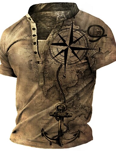 男性用 Tシャツ ヘンリーシャツ グラフィック アンカー コンパス スタンド ピンク ブルー グリーン カーキ色 3Dプリント プラスサイズ アウトドア 日常 半袖 ボタンダウン プリント 衣類 デザイナー スタイリッシュ ヴィンテージ ベーシック