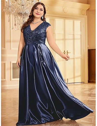 Aラインプラスサイズドレスエレガントカーブドレスフォーマルウェディング床丈ショートスリーブVネックポリエステルVバックスパンコール付き
