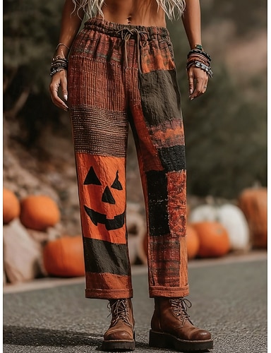 女性用 パンツ ストレート 旅行度假风 ヴィンテージ ファッション 全長 ミディアムウエストPantsHalloween カボチャ パッチワーク ドローストリング パッチワーク 弾性ウエスト 快適 通気性 伸縮性なし アウトドア 日常着 日常 オレンジ 春 秋 レギュラー