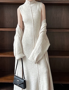 女性用 ロングドレス マキシドレス ニットワンピース カジュアルドレス ドレスセット エレガント ファッション 近代の アウトドア 日常 お出かけ レギュラー 平織り 長袖 スタンド ベージュ 冬 秋
