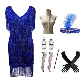 1920年代風 ギャツビー 膝丈 フラップワンピース パーティーコスチューム イリュージョン 半袖 グレートギャツビー タッセル スパンコール タッセル Vネック 仮装 女性用 カーニバル パーティー マスカレード レトロテーマパーティー 成人 1×ブレスレット ドレス グローブ オールシーズン
