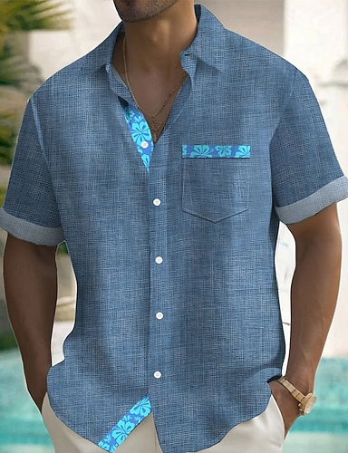 男性用 シャツ サマーシャツ カジュアルシャツ ビーチシャツ ボタンアップシャツ ブルー ダックグレー 半袖 フラワープリント シャツカラー バケーション ハワイアン 衣類 ポリエステル ファッション カジュアル 快適
