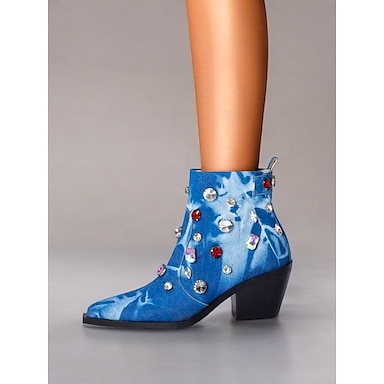 女性用ファッションデニムアンクルブーツ - パーティーやカジュアルな服装にぴったりのラインストーン装飾ブロックヒールウエスタンスタイル